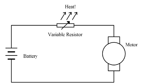 In this scenario, voltage is dropped across the resistor and is wasted as heat. The motor runs at a slower speed due to the reduced voltage level reaching it.